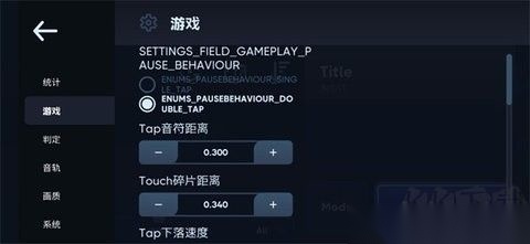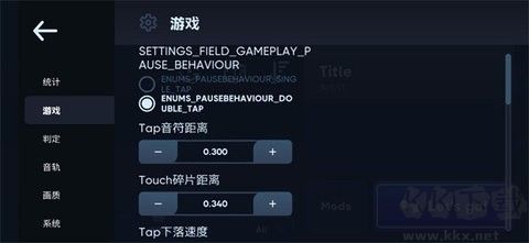 2、给出了若干设置选项,像TURN(将谱面按顺时针转动)、GUIDESPEED(调节音符移动速度)、MARKERSIZE(调节音符大小)、ANGULARATEDHOLD(新添的绿色长按音符)、SOUNDEFFECT(点击音效)等等,玩家能够依据自身喜好来加以调整。