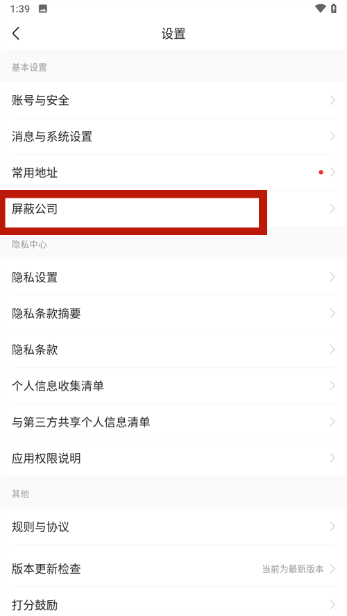 2. 进入“设置”页面后,点击“屏蔽公司”选项。
