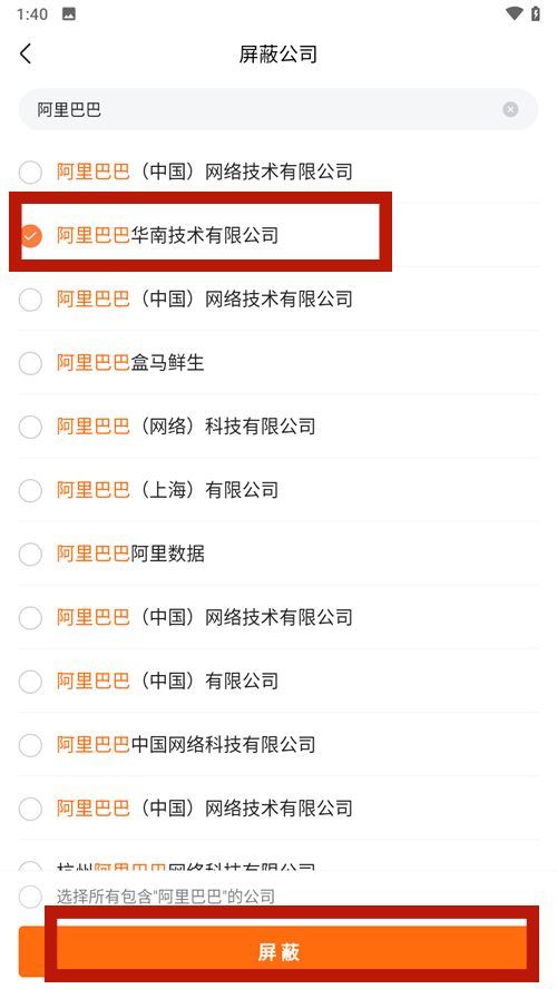 3、在此处搜索你想要屏蔽的公司,点击其前面的圆圈进行勾选,随后点击下方的“屏蔽”按钮即可。