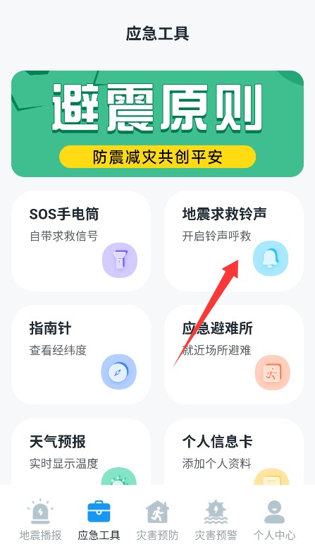 2. 在应急工具页面,选取“地震求救铃声”功能,从而进入警报声音设置及管理界面。