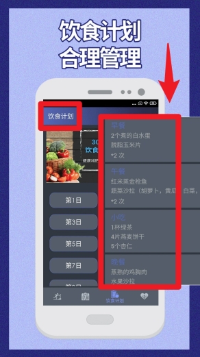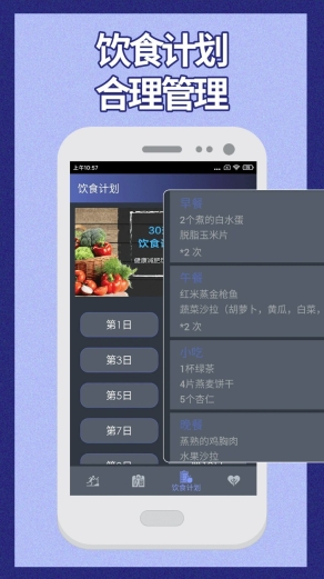 3. 切换至底部的「饮食计划」标签,就能看到每日三餐及加餐的建议,依照日期规划来合理搭配饮食。