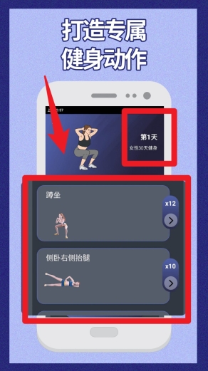 1. 于训练首页点击「第1天」,便能进入女性30天健身计划,按顺序完成诸如蹲坐、侧卧抬腿等推荐动作。