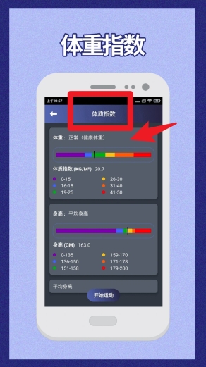 2. 点击进入「体质指数」页面,输入身高和体重信息,系统会自动算出你的BMI指数,并确定身高区间定位。