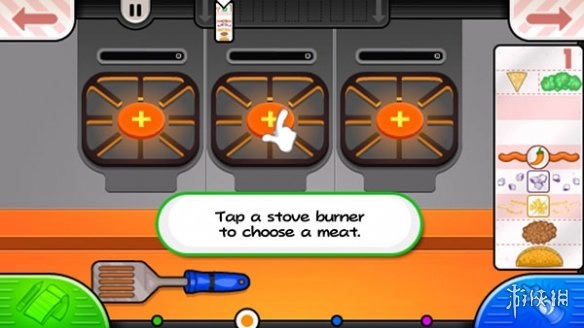 6、现在我们来加热肉类,灶台上有一个计时器,等时间到绿色区域时,拖动铲子翻动食材。