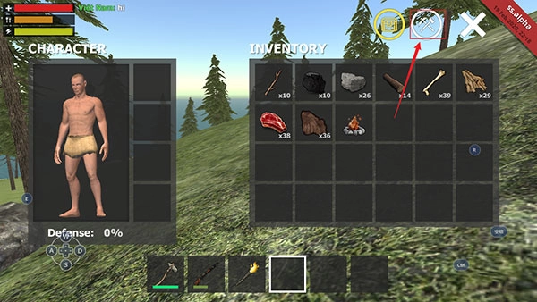 1、在野外生存模拟器游戏中点击左上角的背包图标。