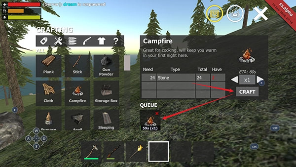 4、在右侧能够看到,搭建Campfire需要24块石头。