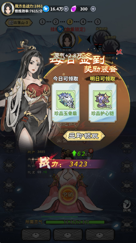 说到这儿,如果玩家想要挑战更高难度的关卡,关键在于提升自身的战力。只需点击图中的“突破”按钮,就能强化战力。此外,玩家在挑战过程中,还能够获取更为丰厚的奖励与装备,把这些装备穿戴在角色身上,可带来更高的战力加成。