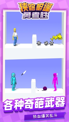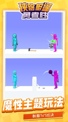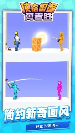 狭路相逢勇者胜是一款充满休闲趣味的卡通对决类游戏。在这里,玩家会化身为灵动且极具魔性的橡皮人战士,凭借精准地投掷武器,与对手展开紧张激烈的对抗。游戏以抛物线物理引擎作为核心机制,巧妙地将策略性与操作体验相融合。每一次进行武器抛掷时,都要综合计算角度、力度以及环境干扰等因素,最终在这狭小的战场之上一决高下。喜爱这类休闲小游戏的玩家,赶紧来畅玩一番吧!