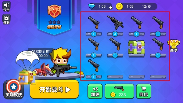 每次战斗都能获得丰厚的金币或钻石奖励。在主界面的合成系统里,可用金币购置武器。只要有两种等级相同的武器,就能进行合成升级。升级后,武器的威力会提升,外形也会改变。