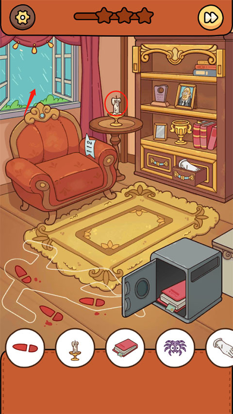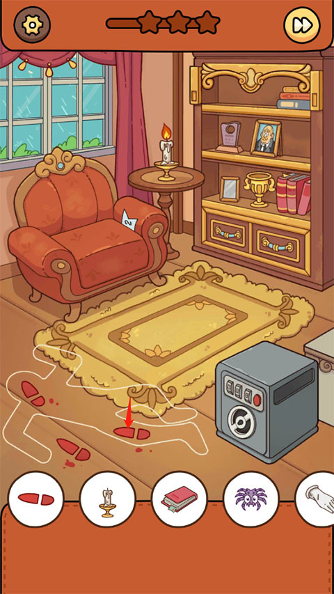 2、第一步是在沙发上找到一张字条,字条上写着密码为112,接着用这个数字打开地面上的保险箱,从中取出里面的书籍。