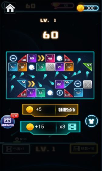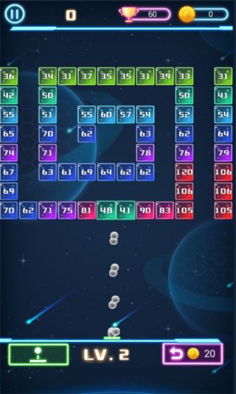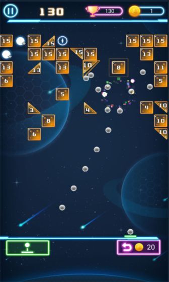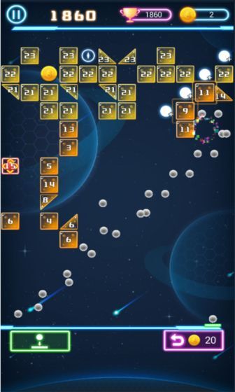 游戏时,玩家只需要左右滑动屏幕控制弹球的发射方向,使弹球能更多的击打到砖块,消灭的砖块越多,得分越高。