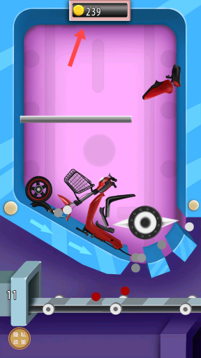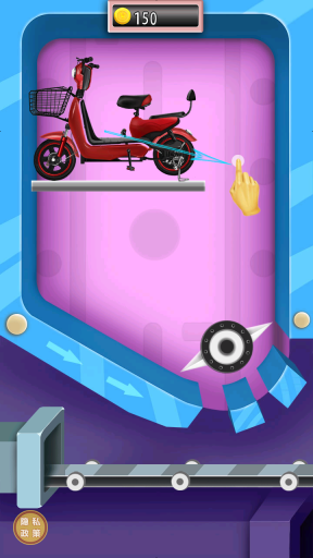 2、进入游戏操作界面后,按照屏幕上的提示进行点击,对红色电动车执行拆解操作,以此来获取金币(例如初始可获得的150金币)。