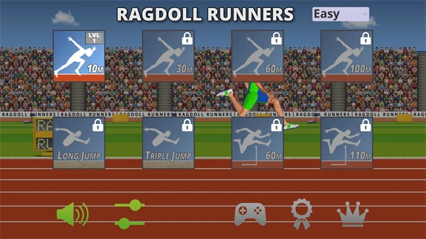 1、进入布娃娃跑步模拟器游戏,刚进入游戏我们也可以选择游戏的难度,点击右上角进行选择,这里建议新手朋友选择最简单的练练手;