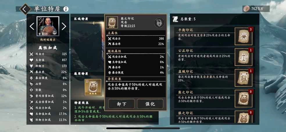 将领养成是权力的游戏:凛冬将至的核心玩法,游戏提供了多条养成线路来提升将领的战斗力,升级、进阶、技能、装备等的升级自然远远不够,军魂训练、宝石镶嵌、将领组合、将领军衔等全方位的养成提升,带给你超乎想象的战力提升,想做到以一敌众也不是不可能哦。