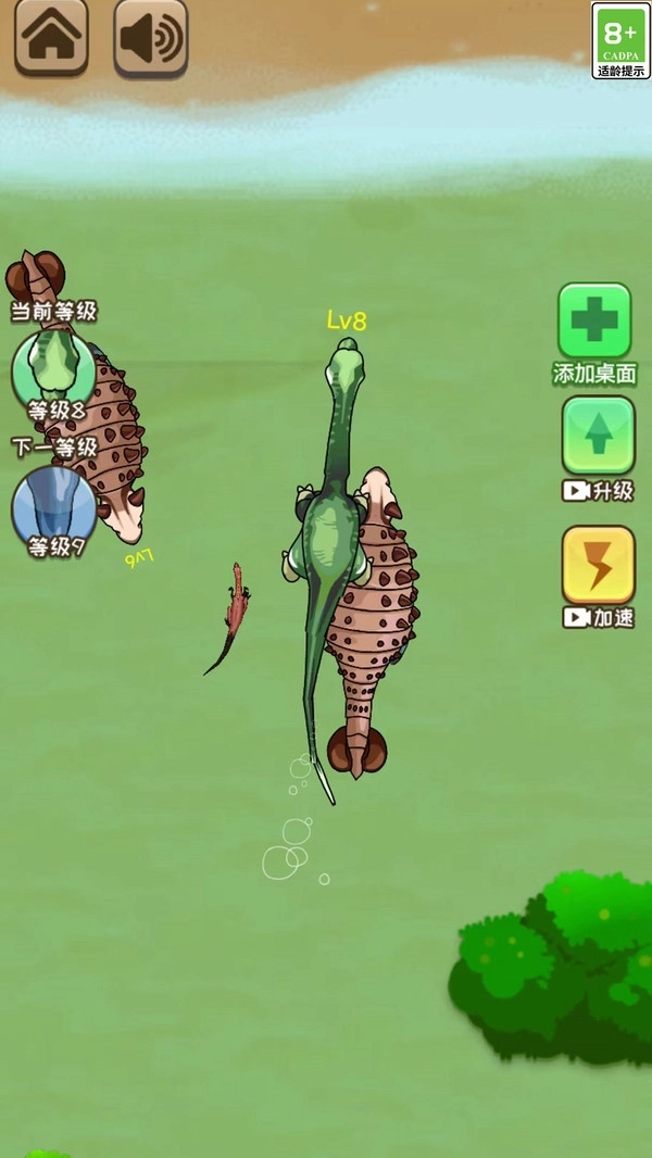 2、在游戏世界里,玩家能碰到其他恐龙,通过吃掉它们来增强自身能力。