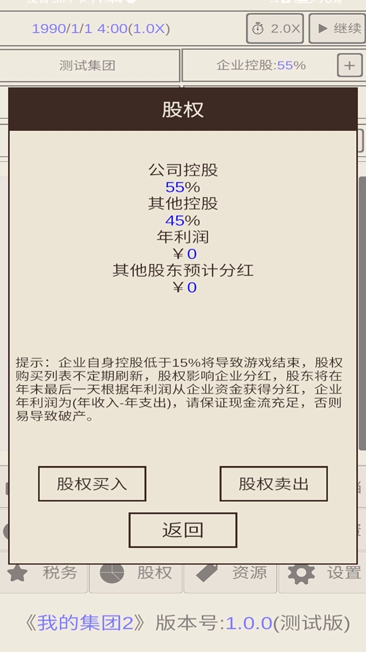 《我的集团2》是一款模拟经营题材的单机文字游戏,玩家将在游戏中化身企业家,通过购置土地、开设工厂、项目投资等方式拓展自己的商业版图。本次更新新增了全新的股权系统,同时还有更多精彩内容等待探索,欢迎大家前来体验!