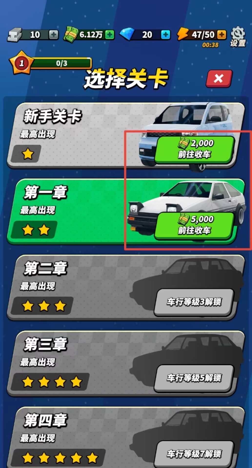 1、从主界面左下角的收购功能入口进入关卡选择页面,该页面涵盖新手教学与正式章节内容,选定关卡后即可开启收车流程。