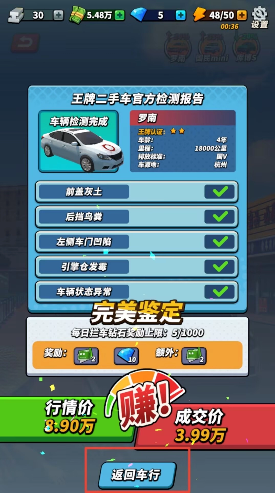 3、完成交易后进入结算环节,通过完美鉴定可获得稀有宝石与资金奖励,确认后返回车行继续开展经营活动。