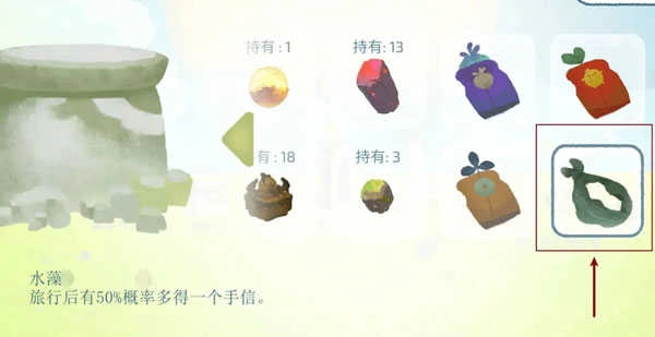 然后在解锁内容的优先级上,建议优先解锁背包,通过挂满道具来提升刷蒲公英的效率。两个背包可以分别用来挂水藻和手信符咒,这样做的目的都是为了提高手信的掉落概率——这里说的手信其实就是蒲公英呀!!!
