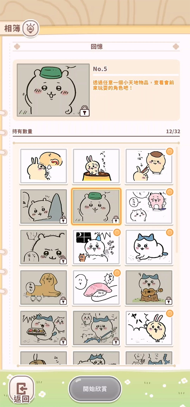在游戏里,当满足特定条件,比如获取角色、得到小天地物品等,就会解锁与角色或物品有关的回忆。这些回忆实际上源自原作漫画,举例来讲,首次获取兔兔时,便会解锁漫画第一话「兔兔吃披萨包」的内容,玩家能随时在相册中进行欣赏。字幕会呈现在另一个窗口,即便关掉也无妨,对于粉丝而言,这是极具价值的收藏要素。
