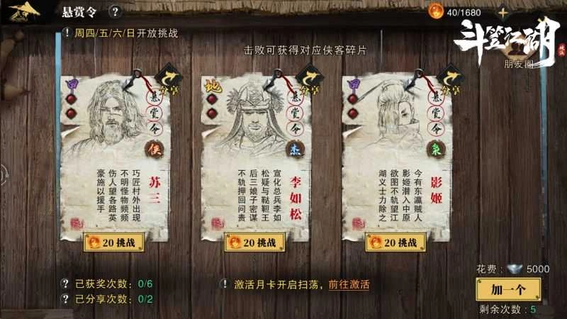 5、江湖之中,每日都有各类悬赏令发布。身为侠客,我们除了邀约好友一同挑战副本外,亦可独自承接悬赏任务,追捕对应的巨盗,从而获取丰厚的悬赏奖励。