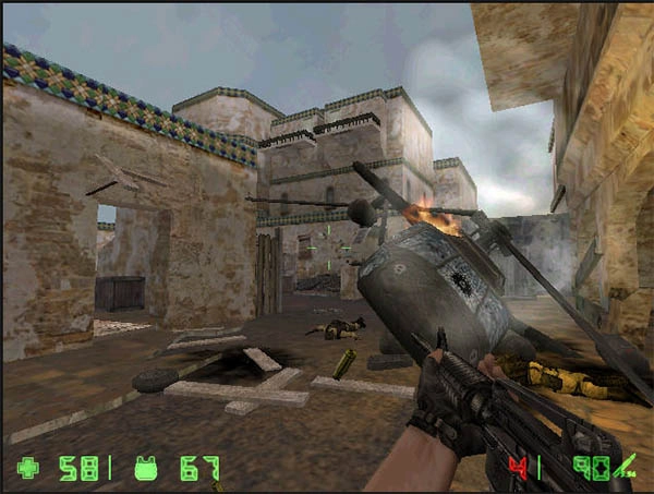 黑鹰已然坠毁,伤亡在所难免,但仍有数名三角洲队员深陷敌围,“绝不能丢下任何一个弟兄!”我随即展开救援行动。我守在熊熊燃烧的黑鹰旁,敌人已如潮水般涌来,我端起枪,几个点射撂倒了冲在前面的敌人。继续向敌阵深处推进,进入一间屋子,解决了突然冲出的两名敌兵,环顾四周发现已无去路,我暗骂一声,一梭子弹扫向墙边的木箱,墙上随即露出一个破洞,便从这里钻了过去。在铁架上找到炸弹后,沿木板爬上二楼,只见墙面红光闪烁,按动5号键设置好炸弹,我闪身躲到一旁,按下了引爆器——轰隆一声,墙壁被炸出个大洞。刚探出头观察,一束红光扫来,我急忙缩回:是狙击手!装好子弹深吸一口气,我闪电般冲出去,子弹呼啸着射出,对面楼上传来惨叫,敌狙击手应声栽落!
