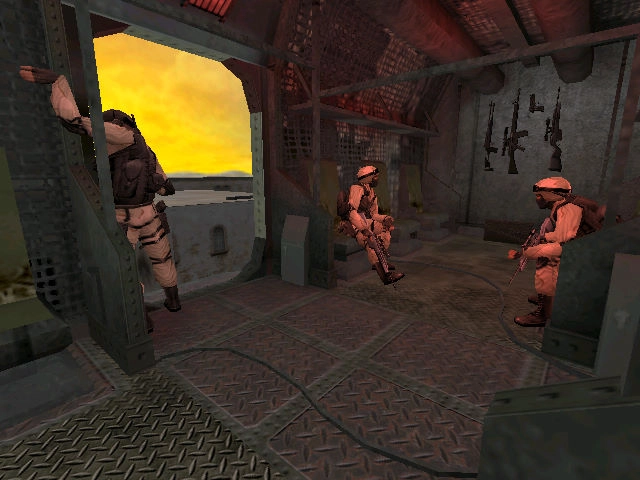 进了室内,透过玻璃看到下面敌兵正在战前动员,我立刻用相机拍下情况。刚拍完,队友就冲了进来,下面瞬间变成激烈战场,我得马上下去。正好两个敌兵撞在我枪口上,那就不客气了……