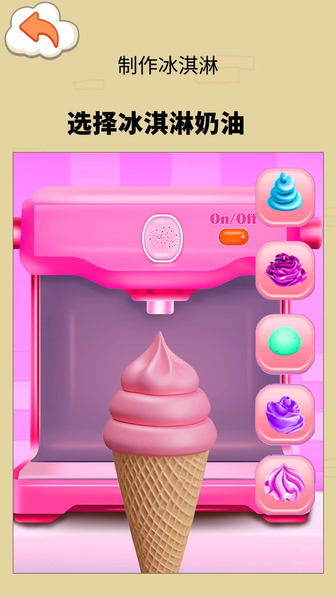 1、点击开始按钮后,按照页面提示挑选喜欢的口味与所需材料,动手制作专属自己的冰淇淋。