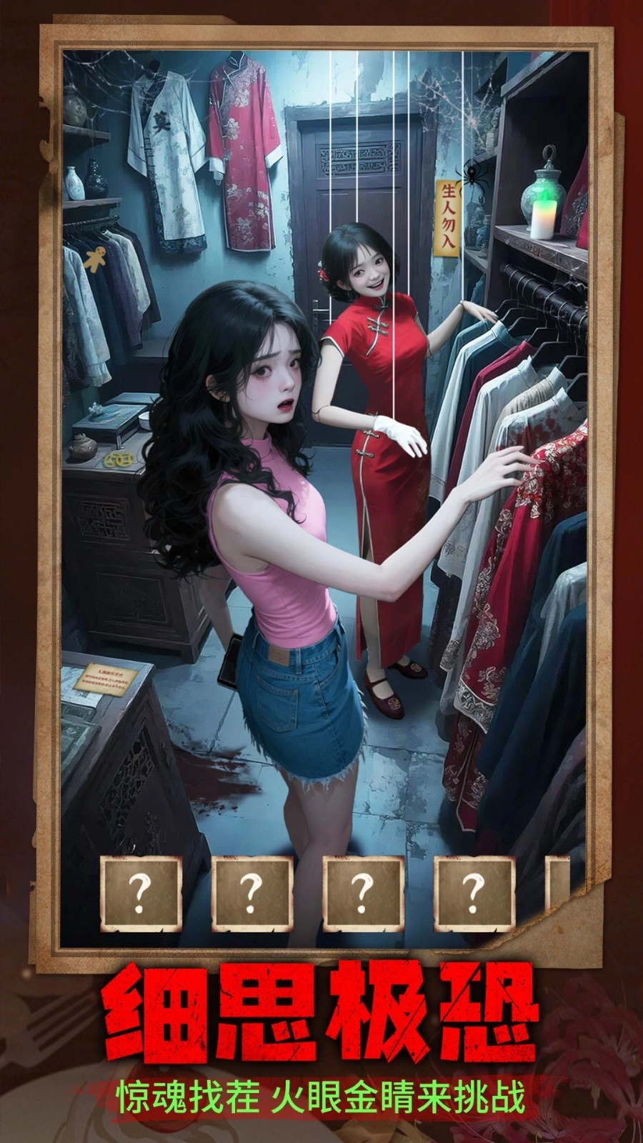 1、运用昏暗的场景与惊悚的音效相结合,营造出紧张刺激的解谜氛围。画面以暗色调为基调,配合扭曲的人物形象与动态光影效果。