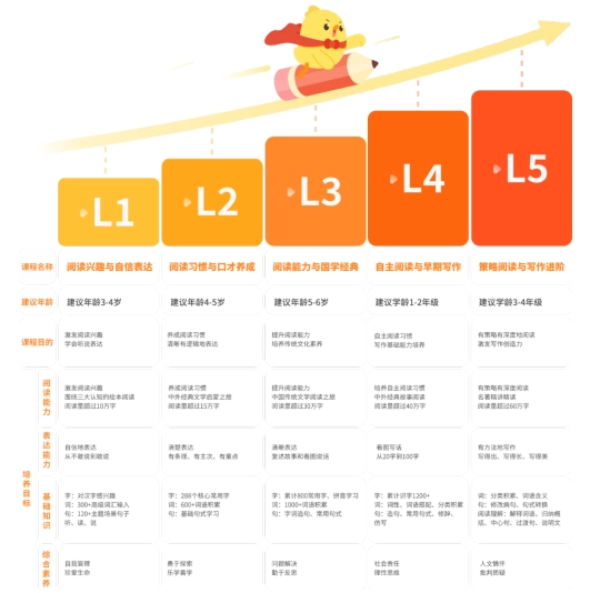 L4阶段:依据小学1-2年级的课程标准要求,融入写作相关知识,着力培养孩子的写作基础能力与自主阅读的良好习惯。