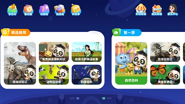 主页里设有不少学习模块,左上角还能选择学百科、看动画、动脑筋、练思维、听故事等内容;
