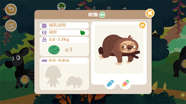 完成后,系统还会生成信息卡片,像树懒喜爱的食物、体重体型等内容都包含在内,点击小喇叭按钮还能听到对应的声音呢。