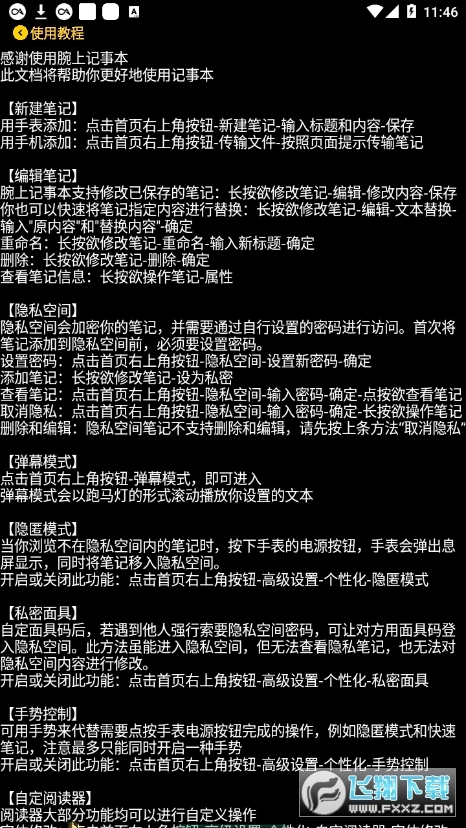 腕上记事本这款软件属于笔记记录类应用,用户能够在其中创建新笔记,随心记录日常生活点滴与心情感悟。此外,软件支持开启弹幕模式,让文本内容以跑马灯的方式滚动播放,还具备手势控制功能。如果对这款软件感兴趣,不妨点击体验一番!