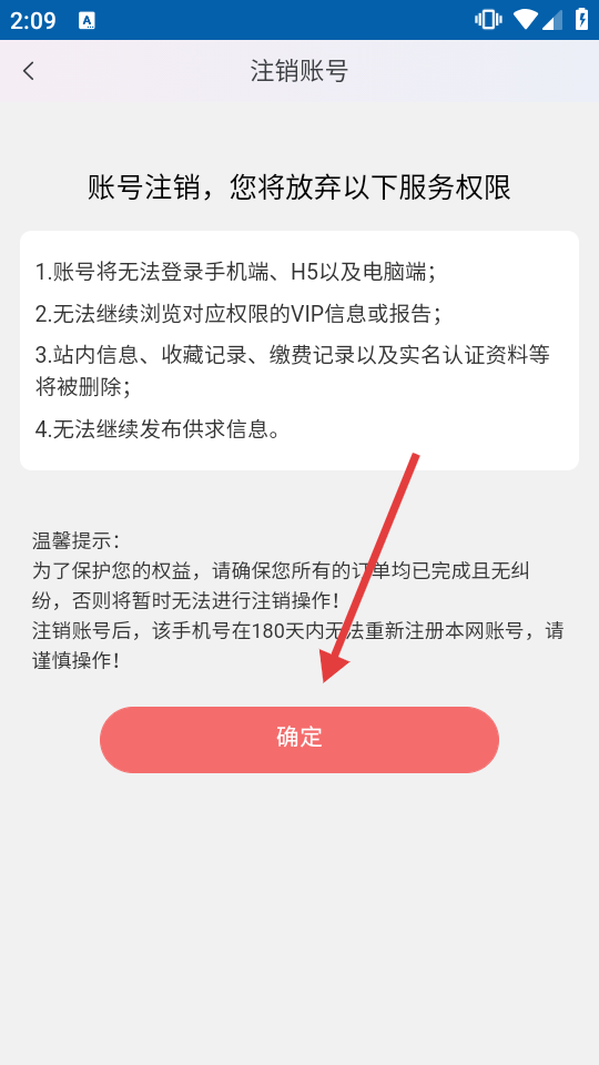 4、最后阅读提示后,点击【确定】完成账号注销。