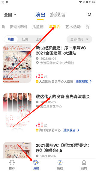 2、若您有购票需求,可点击“演唱会”板块,选择您偏好的演出类型,再点击您想观看的具体演出。