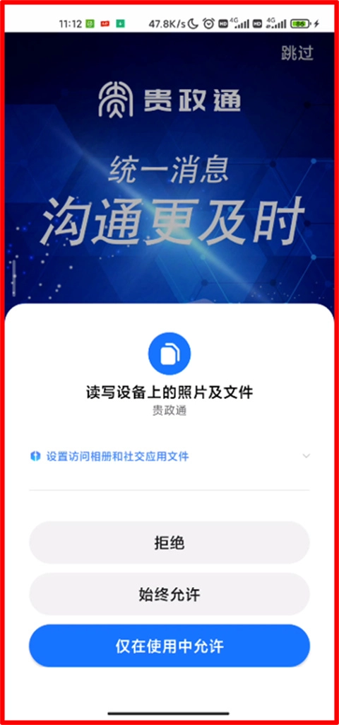 首先打开贵政通,接着点击“仅在使用中允许”这个选项,一定要记得开启权限哦!