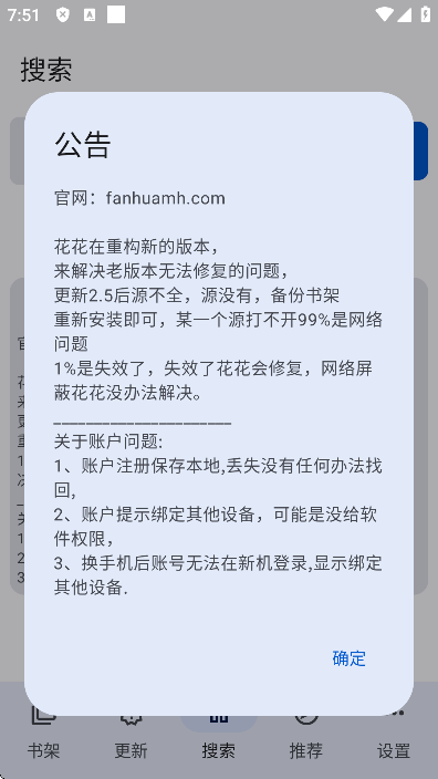 5.认准正版界面,五个栏目,分别是书架,更新,搜索,推荐,设置等。