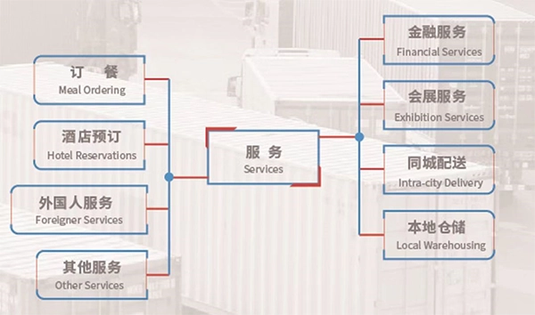 服务涵盖:订餐、酒店预订、面向外国人的服务、其他各类服务、金融服务、会展服务、同城配送以及本地仓储。