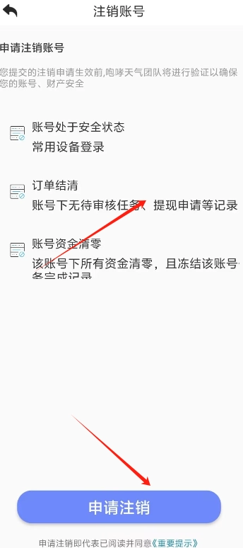3、当用户阅读完账号注销提示内容后,点击“申请注销”,就能成功完成注销操作。