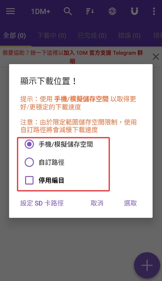 2、在下载位置设置页面,可选择手机存储、模拟空间或自定义路径,并设置是否停用编目。