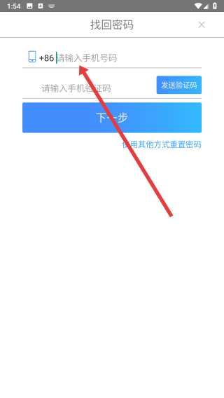 2、跳转到找回密码页面,可以点击上方输入填写手机号码,以便发送验证码完成后续操作。