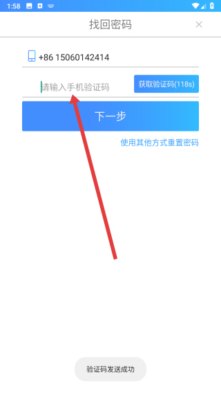 3、在点击发送验证码按钮,等待后填写验证码,即可进入到下一步骤。