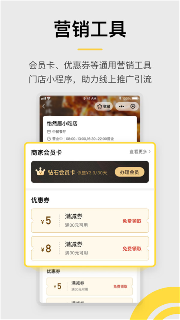 - 线上门店推出全新操控界面,配备丰富经营工具,助力您提高获客与收款的成功率。