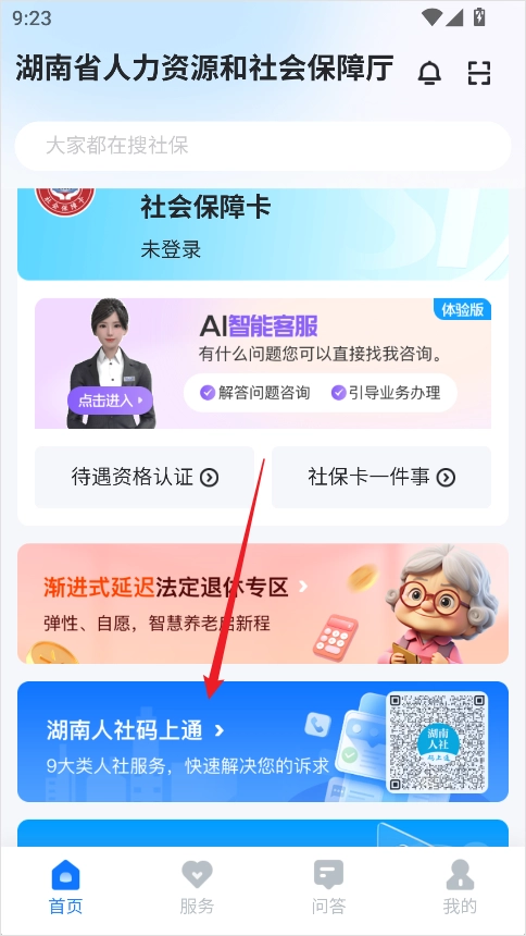 1、打开湖南智慧人社App,在首页向下滑动,找到【湖南人社码上通】专区;