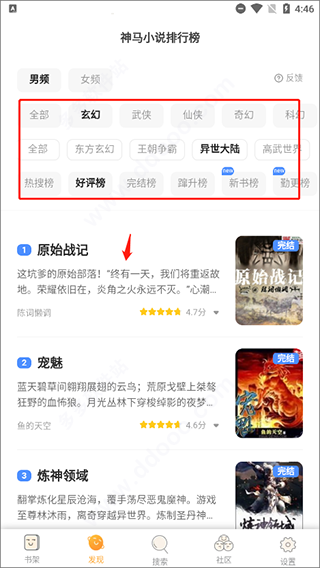 3、在选择小说类型之后,还能够看到软件所提供的热搜、好评、完结、飙升、新书等各类榜单。