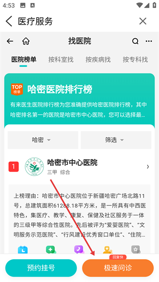 4、于找医院页面点击【极速问诊】按钮,便能开展快速问诊操作。
