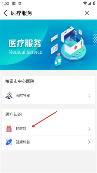 3、于医疗服务页面,点击【找医院】这一选项,随即进入找医院页面。