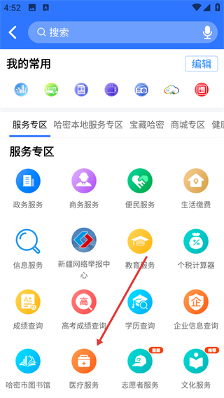 2. 在服务列表页面的服务专区里,点击【医疗服务】选项,从而进入医疗服务页面。