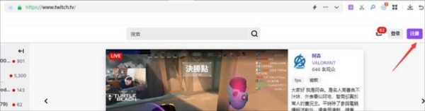 1. 开启Twitch,点击右上角的【注册】按钮。若账号未登录,该按钮显示为紫色;登录账号后,按钮则显示为黄色。