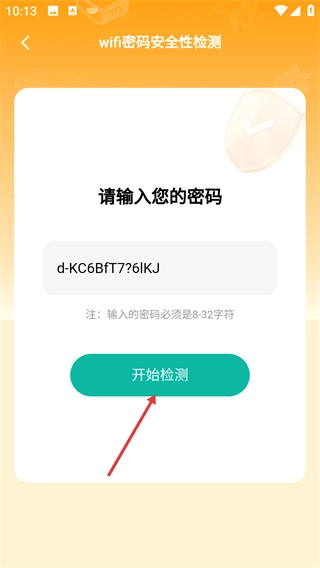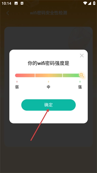 4、轻点【开始检测】按钮,查看WiFi密码强度的检测结果(显示为弱/中/强),最后点击【确定】,完成整个检测流程。